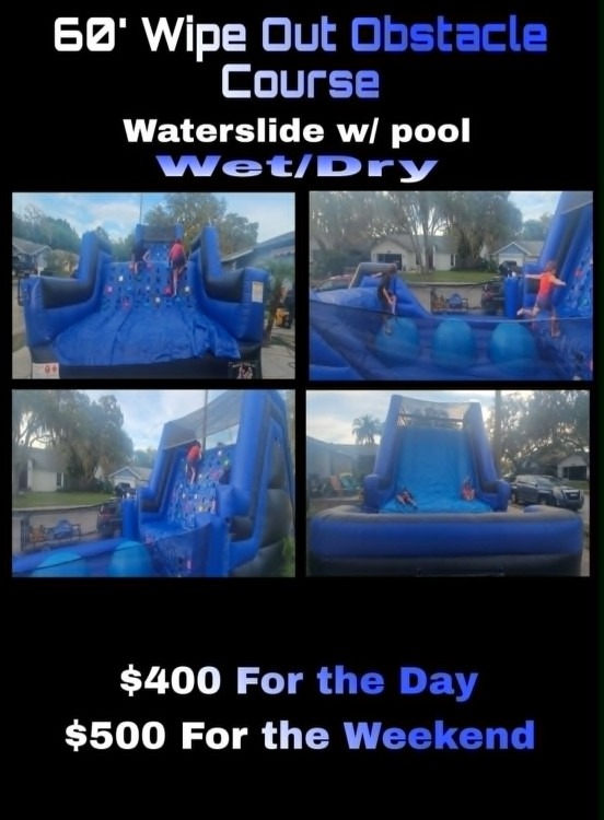 The 60-foot Wipe Out obstacle course is a high-energy, adrenaline-pumping challenge designed for thrill-seekers of all ages. Spanning 60 feet in length, the course tests balance, agility and coordination. huge wide slide. Great for big parties or events