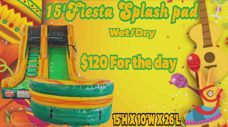 Turn any celebration into a party with our colorful Fiesta Splash Pad! At 15 feet long, this unit can be used wet for a refreshing splash experience or dry as a fun inflatable play zone. Perfect for birthdays, summer parties, and backyard events. Safe, soft, and perfect for kids of all ages!